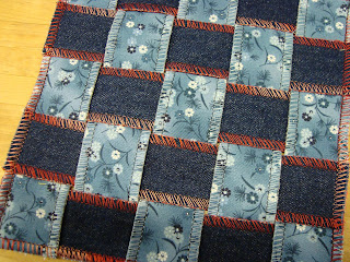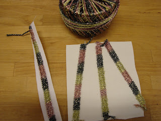 Här har jag använt en melerad rayontråd samt den tretrådiga overlocksömmen. Jag klippte remsor