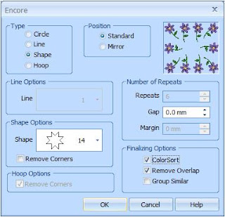 Encore är en funktion för att placera kopior av en design på en linje, en cirkel, en form eller runt bågen. Alla skärmdumpar är tagna från 5D, vissa saker skiljer sig mellan 4D och 5D. I exemplen har jag främst använt maskinsömmar, minidesigns och bokstäver.Funktionen finns på Designfliken och blir aktiverad när du har ett broderi markerat.