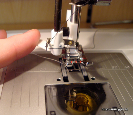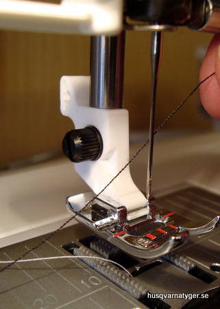 Trä din symaskinsnål genom att föra tråden neråt på den högra sidan av nålen tills du känner att tråden ”hakar” in i nålsögat.