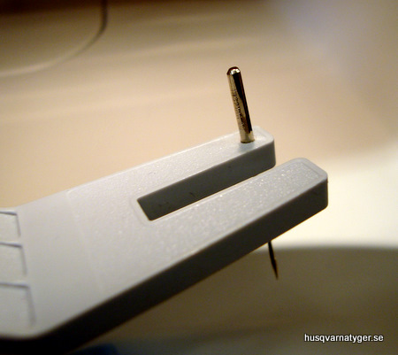 Släpp försiktigt upp nålpåträdaren och en ögla kommer ut på baksidan av nålsögat. Jag brukar hålla i den lösa trådändan för att se till att tråden hakar i den lilla del som drar tråden genom ögat.